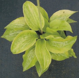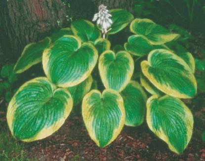 Een soft bonte Hosta met geel-groen blad, en een lichtere gele zeer brede rand.
