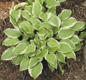 Hosta met appelgroen blad, omzoomd met licht gevlamde crème rand.